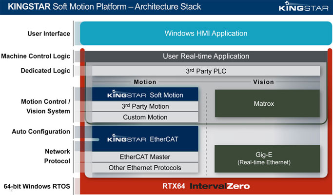 Kingstar通过端到端,开放和标准的软件平台解决了这个问题,允许工程师从头开始选择他们选择的运动控制和机器视觉的组件。基于硬实时确定的64位操作系统(RTOS),IntervalZero的RTX64的基础,所有由运动控制工程师选择的组件都可以是Kingstar的预集成和预测试的解决方案或其自己选择的组件。