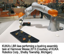 “LBR IIWA尤其擅长使用力引导的装配任务,例如齿轮啮合,钉孔插入,并搭扣配件,”高级工程师Michael Gerstenberger说:Kuka Robotics Corp.在谢尔比镇,密歇根州。